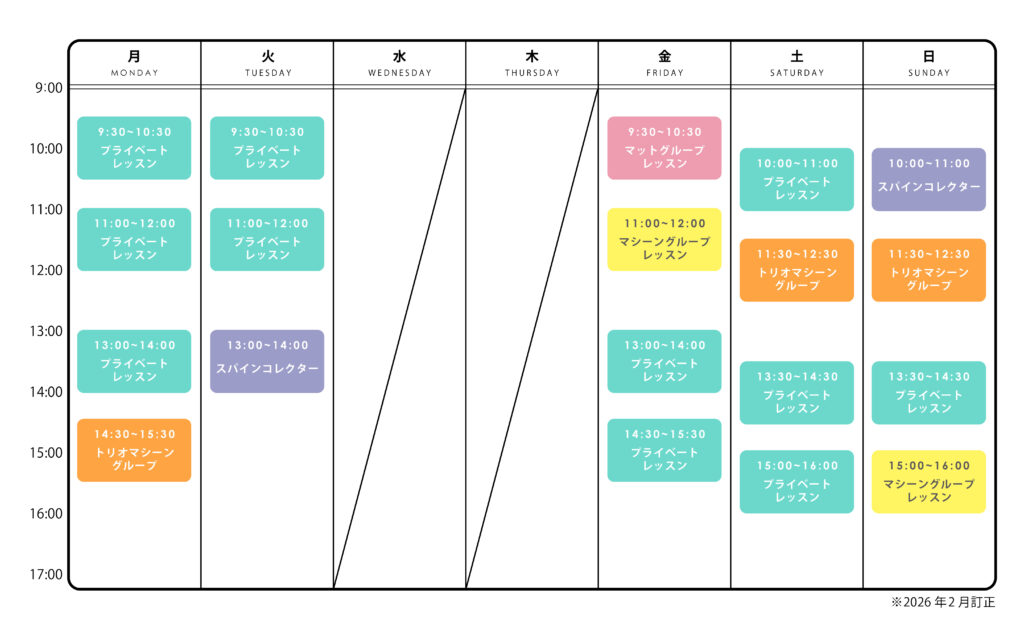 体験レッスンは、スケジュールの水色のプライベートレッスンの時間帯にご予約いただけます。